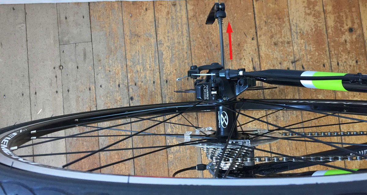 Next, adjust the quick release to the proper tension. Open and close the lever with one hand while gradually tightening the end nut with the other. Continue tightening until you feel resistance on the lever at the mid-point of its travel. It should leave an imprint on the palm of your hand when closing.
