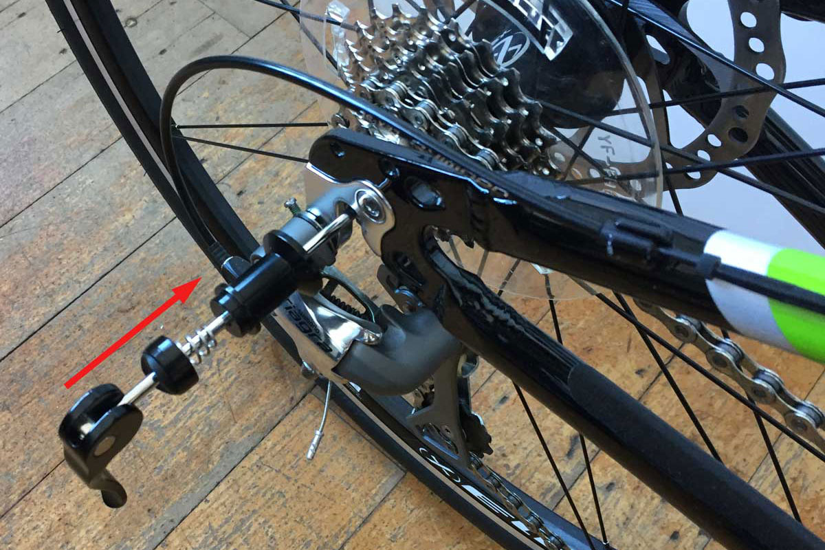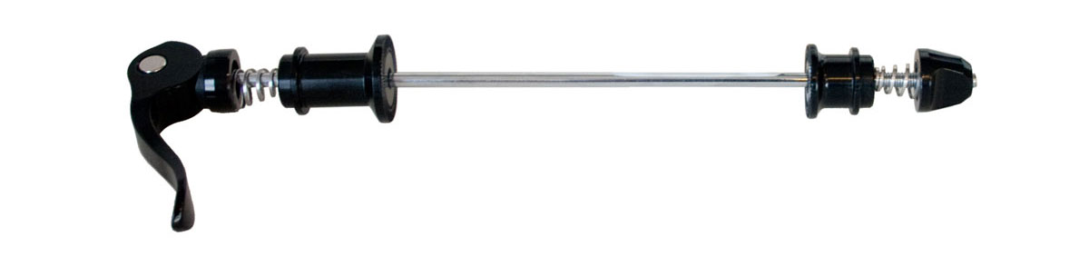 RackStand comes with a longer replacement quick release skewer that includes two spacers that the rack will mount on. Remove the end nut, spring, and shorter spacer (shown on the right in the photo above).