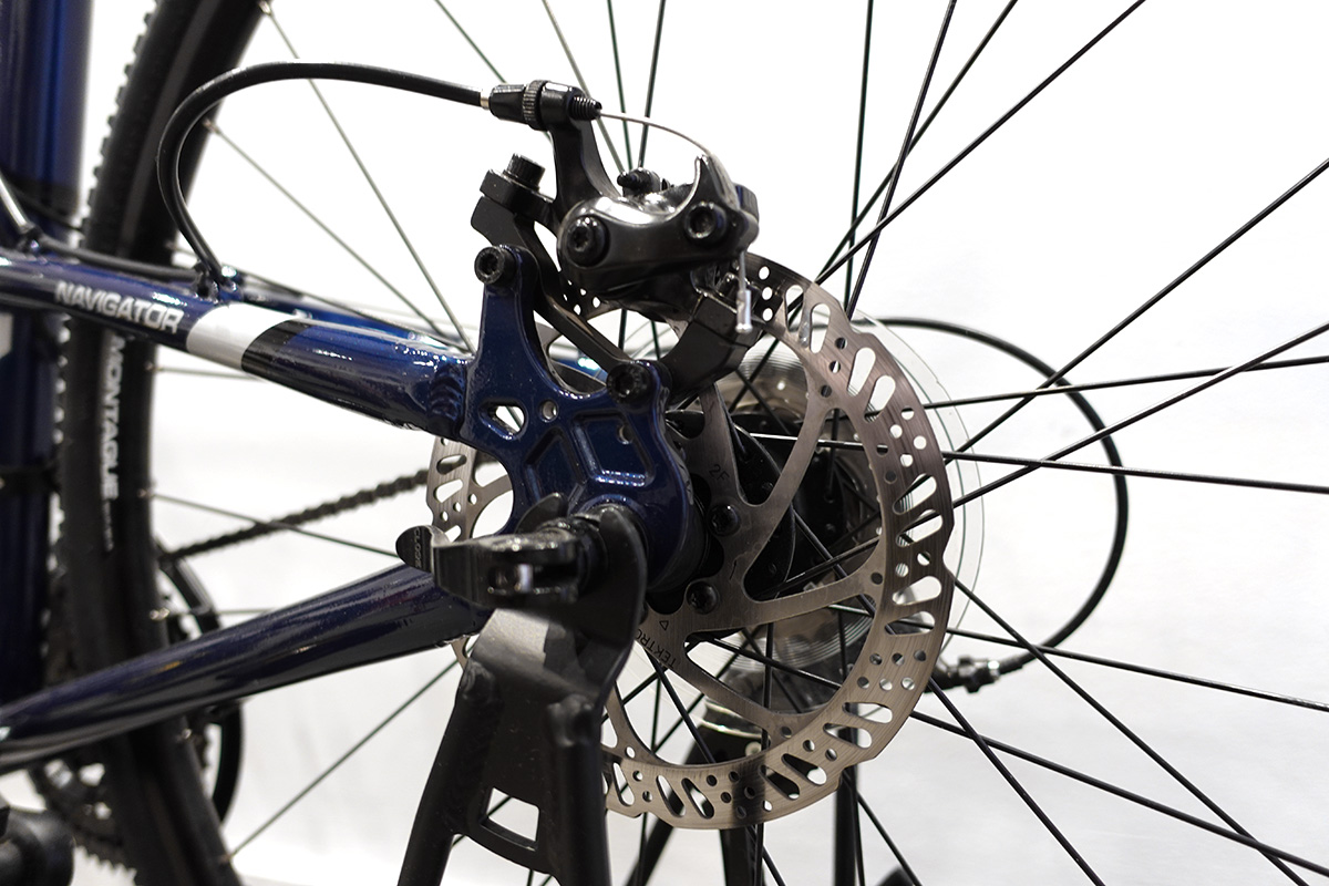I’m working on Tektro Aries brakes, which come standard on the Montague Navigator, but the process for adjustment will be similar for other models. Most mechanical disc brakes have one pad that stays stationary (the inside one), and one pad that moves (the outside one) in order to apply pressure to the rotor. The rotor actually flexes toward the stationary pad so it’s squeezed between the two.