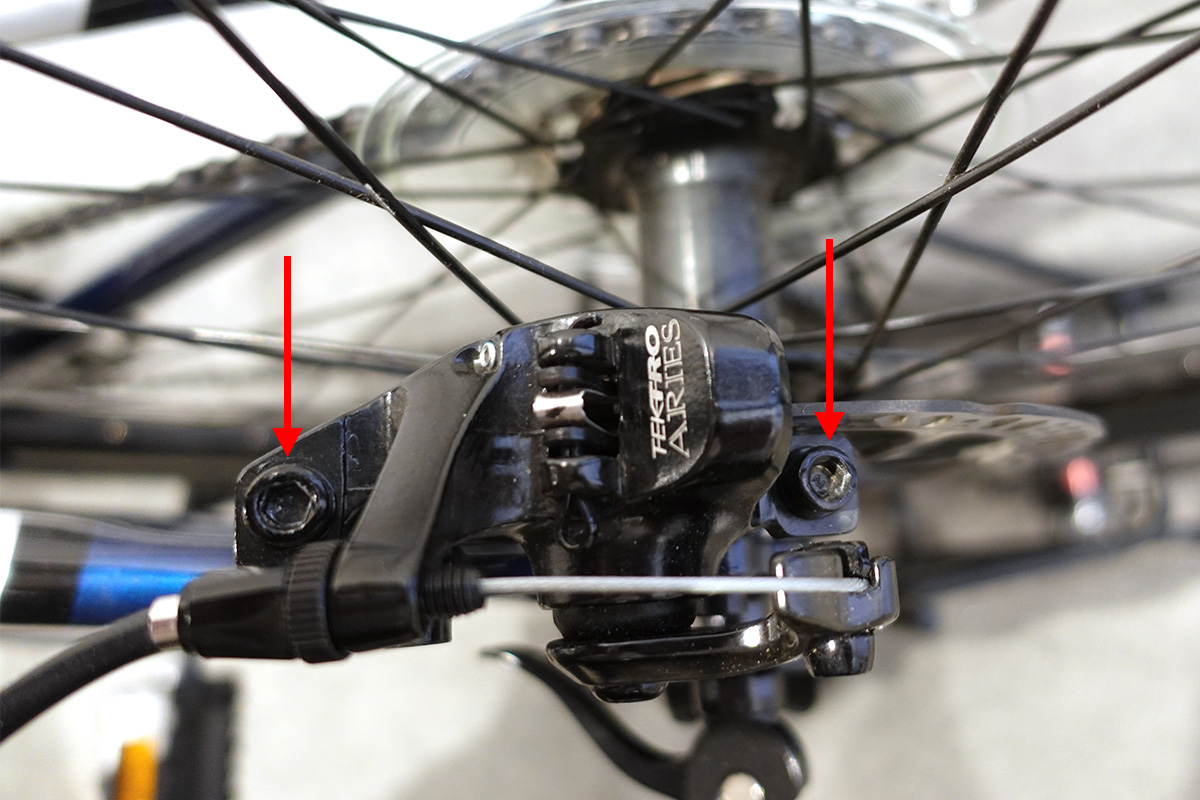 The first thing to set when adjusting your disc brakes, is the position of the caliper itself. There are two bolts that hold the caliper on the mounting bracket. By loosening them, you can move the caliper slightly from side to side.