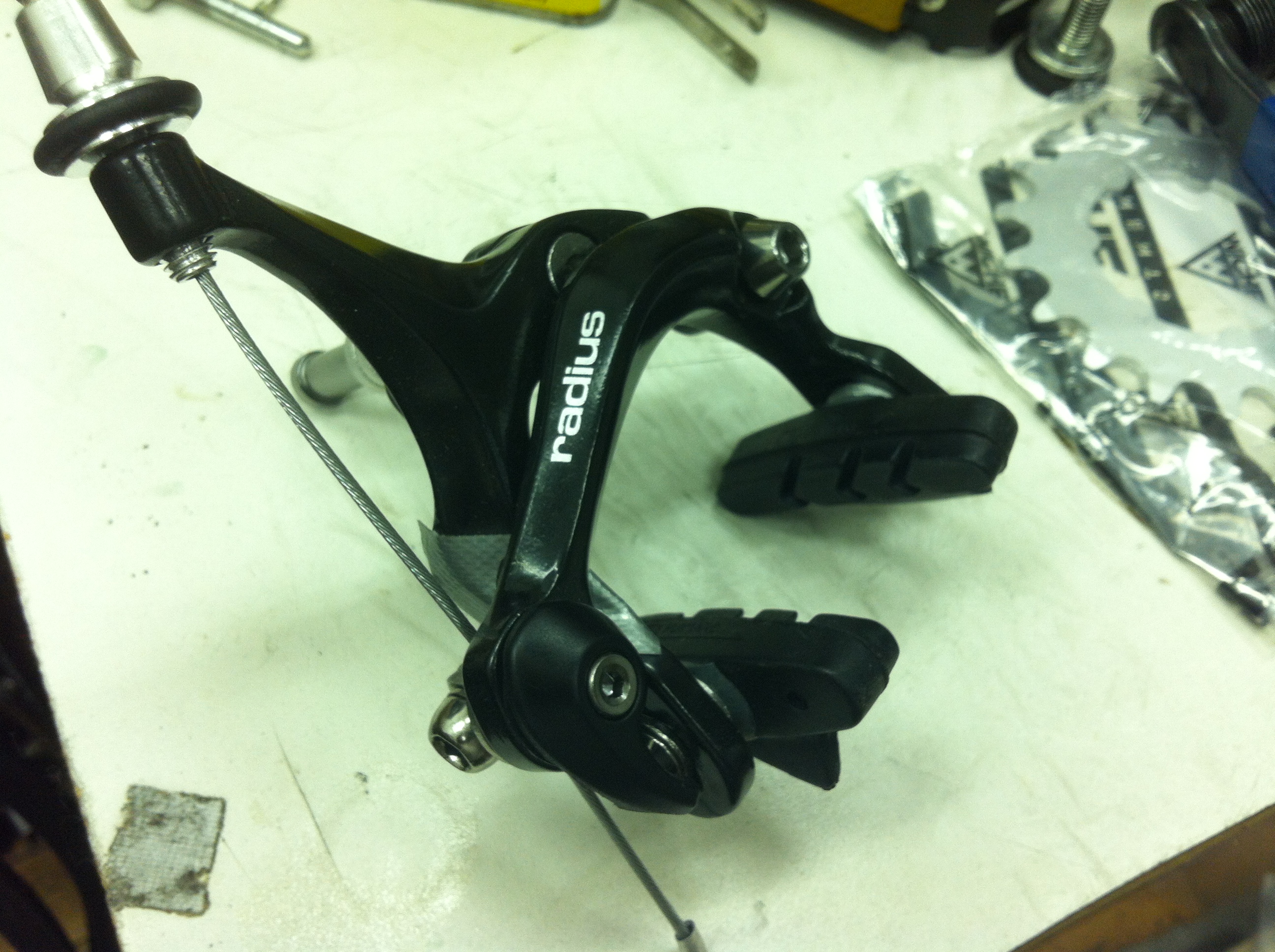 I’ll be installing a dual pivot road caliper. Caliper brakes are the design of choice for most bikes meant for on road riding. They mount to a single point above the wheel, which allows the brake arms to automatically center on the rim (theoretically). Larger tires require longer and deeper calipers, which in turn have less mechanical advantage. This is why you don’t see caliper brakes on mountain bikes or cruisers with fat tires.