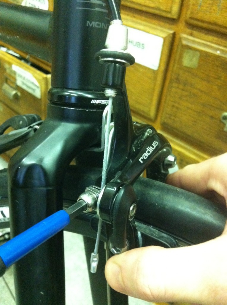 You also want to set the pad distance to the rim. To make the brakes as efficient as possible, you want the pads to rest as close to the rim as they can without touching. You can physically squeeze the brake together with your hand, then pull the cable down again to tension it. While still squeezing the brake together, tighten the nut holding the cable: