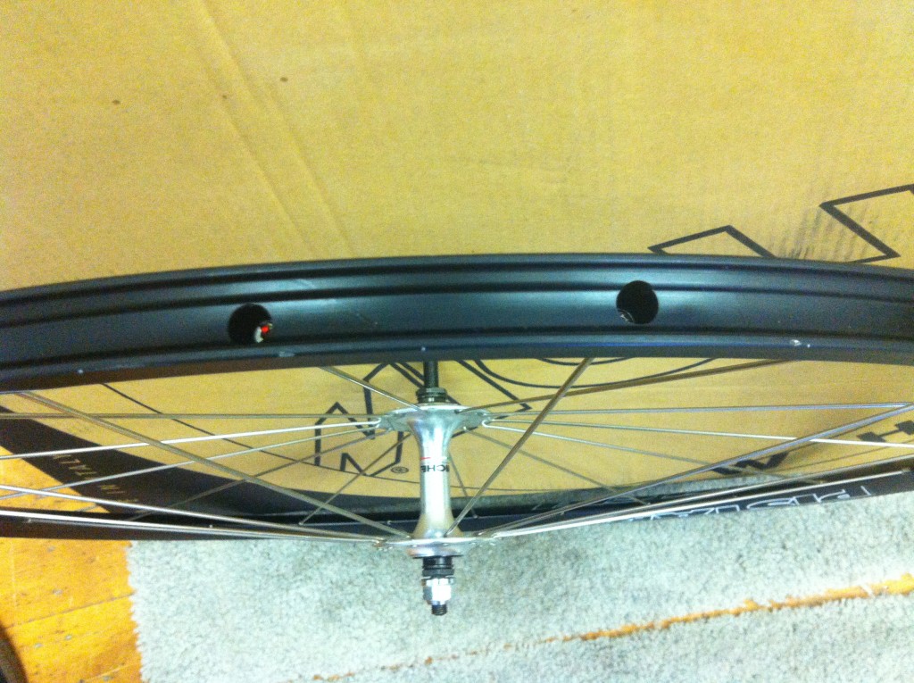 The rim tape covers these holes to protect the inner tube. If you were to install a tire without rim tape, the inflated tube would expand into the holes, and the sharp edges would quickly result in a flat. I picked up some WTB rubber tape, but cloth tape is also a popular option: