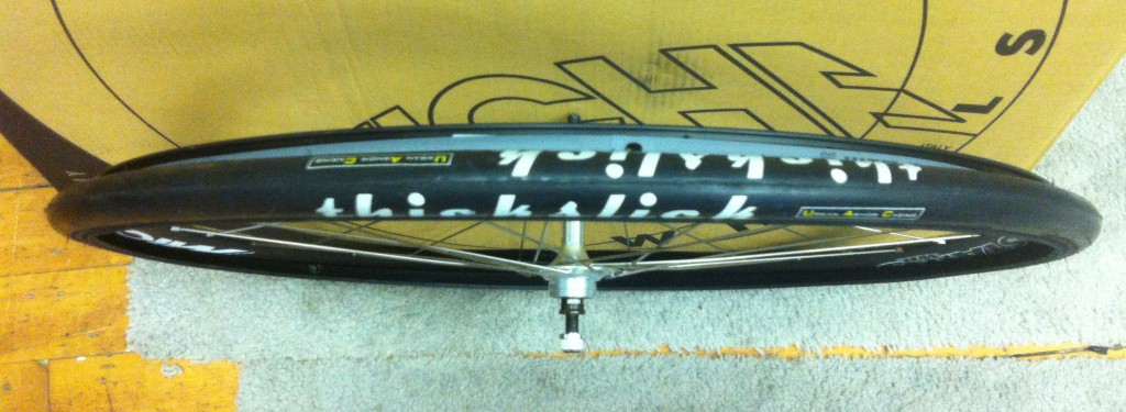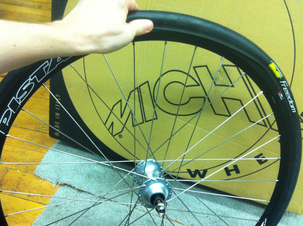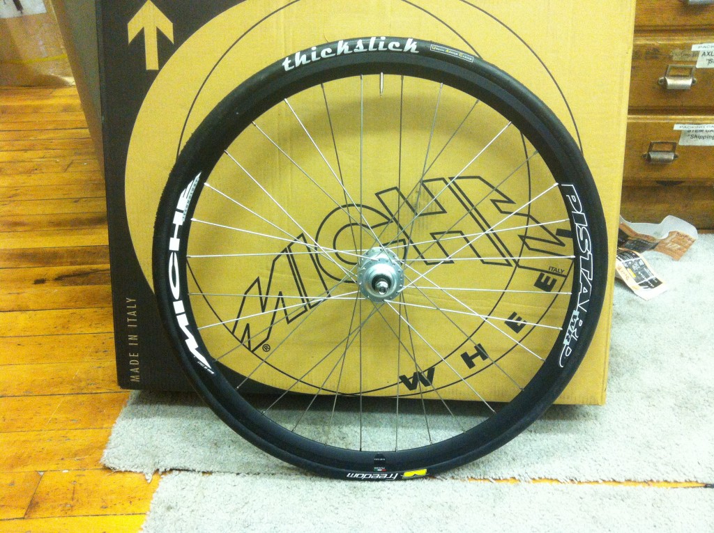 The next step for my custom Montague folding bike is a new wheelset. With horizontal, track style dropouts, and 120mm hub spacing, the Boston is made specifically for use as a single speed. The stock version comes with a flip flop hub; a freewheel on one side, a fixed cog on the other. You can switch between the two by simply turning the wheel around. I’ve had a fixed gear in the stable for years now, and I think it’s a lot of fun (of course I have a geared road bike as well…and a mountain bike… and a bmx bike. Who could have just one bike?!). So, I’ve picked up a Miche wheelset with track hubs, to make this Boston a fixed commuter.