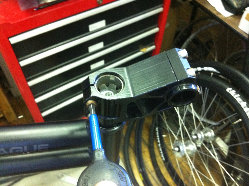 Slide your (in this case new) stem on to the steerer tube, and push it down so it’s snug against the headset. The top of the stem should actually stick up above the top of the steerer tube by about 3-4mm. If it’s too short, add another spacer under the stem. Put the top cap back on, and thread the cap bolt back into the star nut. Make it snug, to compress the headset bearings, but don’t overtighten. If you do, it will be hard to turn the fork, and you’ll be putting extra wear on the bearings and cups.