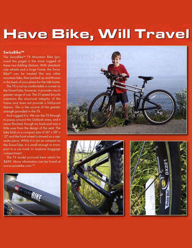 The SwissBike TX Mountain Bike (Pictured this page) is the more rugged of these two folding choices. With standard-size wheel and a large frame, the SwissBike can be treated line any other mountain bike, then packed up and thrown in the back of your plane for the ride home.