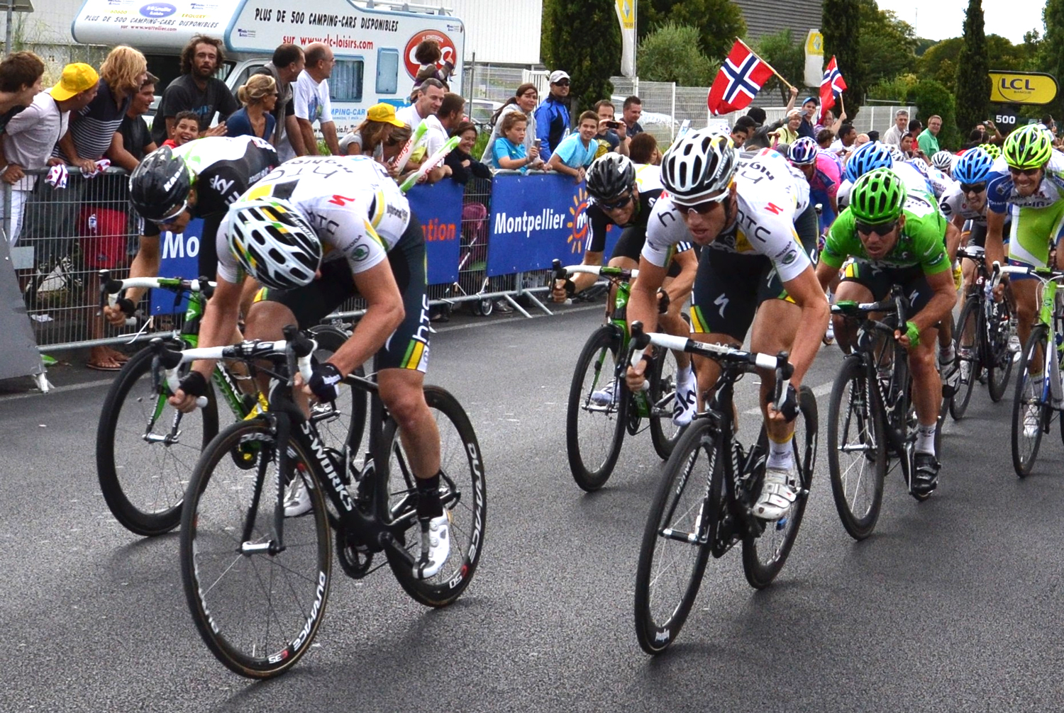 Sprinters are capable of rapid accelerations and putting out an immense amount of power over a fairly short period of time. You will see sprint finishes on relatively flat stages, as mountainous ones tend to break up the group and leave the sprinters toward the back. During a sprint finish, it is the job of a sprinter’s team to provide a “lead out”. In other words, keep him at the front of the group until the last few hundred meters where he can finally give 100% to the finish.
