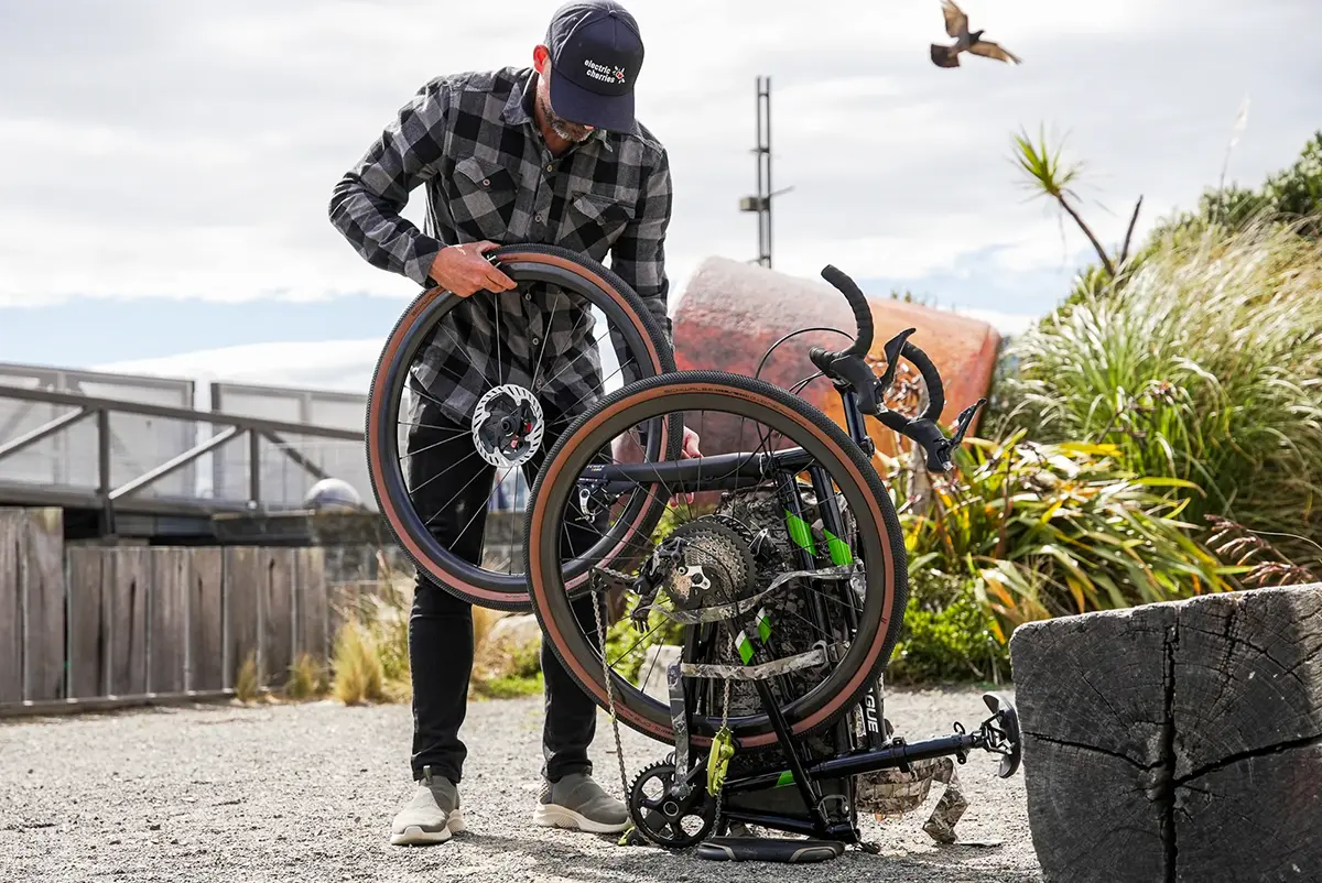 This amazing custom Montague folding bike comes to you all the way from Bicycle Junction in Wellington, New Zealand. The concept for this build, and the very unique use-case, comes from the mind of Mike Casey, who Bicycle Junction says “is one of those people who just does things differerently”. Mike owns and operates Forest Lodge Orchard, the first cherry orchard in the world that is 100% electric and zero fossil fuel in its operation. Mike is also the CEO of Rewiring Aotearoa, a non-profit dedicated to helping New Zealanders transition to sustainable energy.