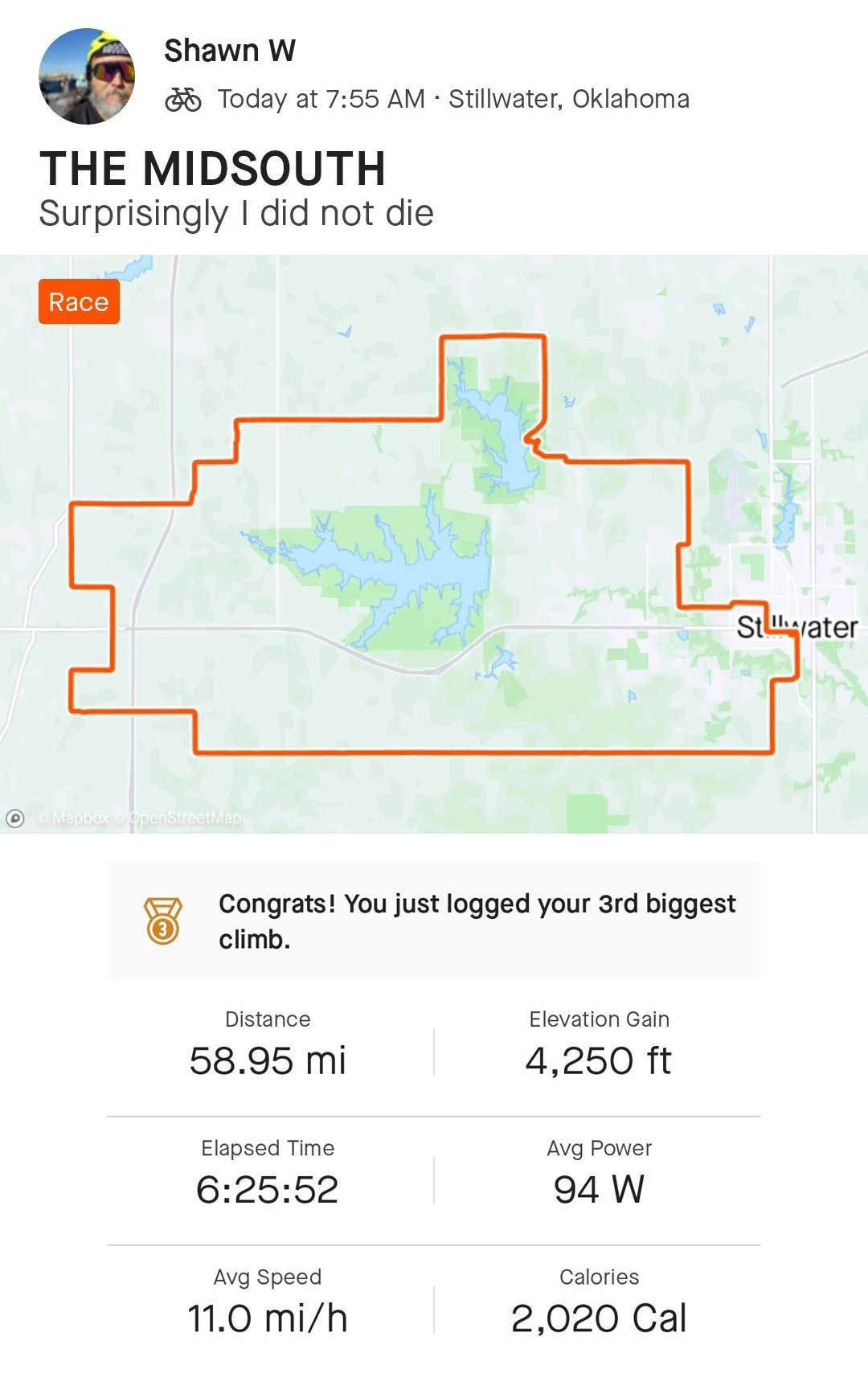 You can follow Shawn’s adventures on Instagram at @shawn_duubs and on Twitter at @shawn_dubs, and if you want see more video of the route, conditions, and celebrations at Mid South, check out his YouTube playlist here.