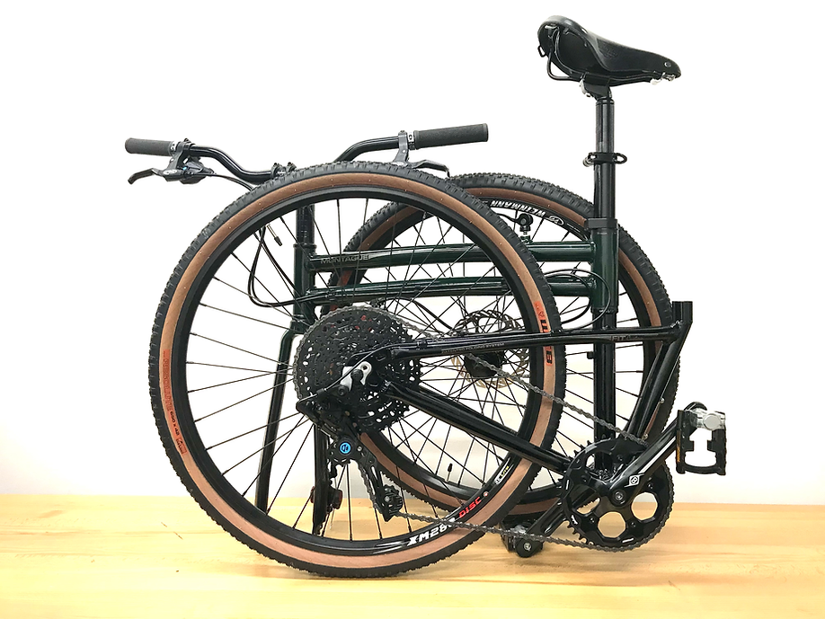 Additional unique touches include a 28-inch riser handlebar, a Box Three Prime 9 x-wide (11-50t) drivetrain, and a Brooks B17 saddle for comfort and a refined look. Even though this frame has the “classic” folding frame design, it still folds in seconds to easily stow away wherever this bike travels.