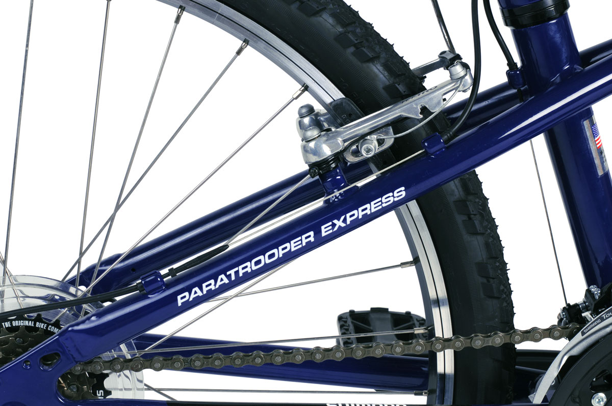 With front suspension and semi-knobby tires, the Paratrooper Express is at home on-road and off. It makes for the perfect light trail bike or rugged commuter, and like all Montagues, the Express is designed to fold and fit anywhere.