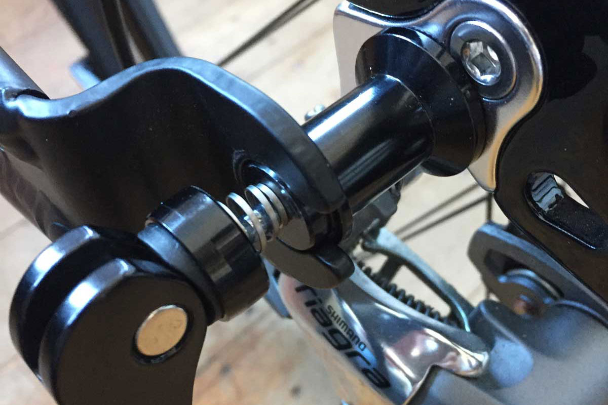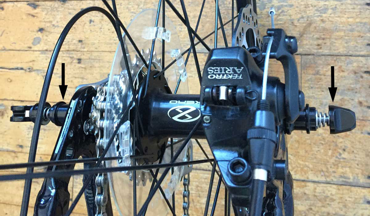 RackStand comes with a longer replacement quick release skewer that includes two spacers that the rack will mount on. Remove the end nut, spring, and shorter spacer (shown on the right in the photo above).