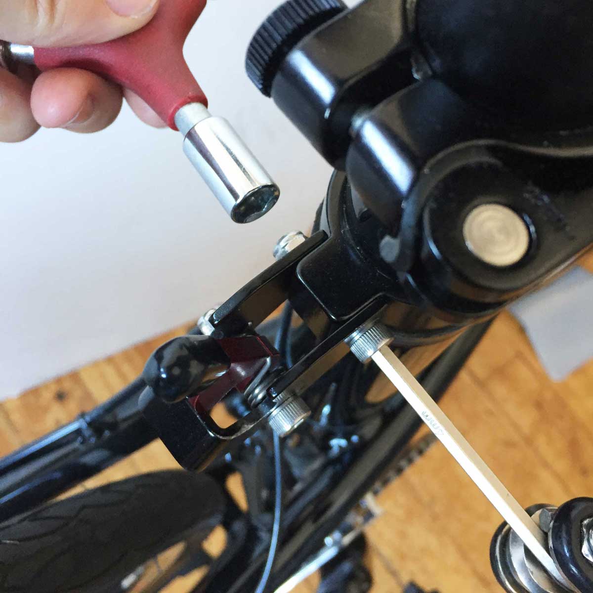 Next, adjust the quick release to the proper tension. Open and close the lever with one hand while gradually tightening the end nut with the other. Continue tightening until you feel resistance on the lever at the mid-point of its travel. It should leave an imprint on the palm of your hand when closing.