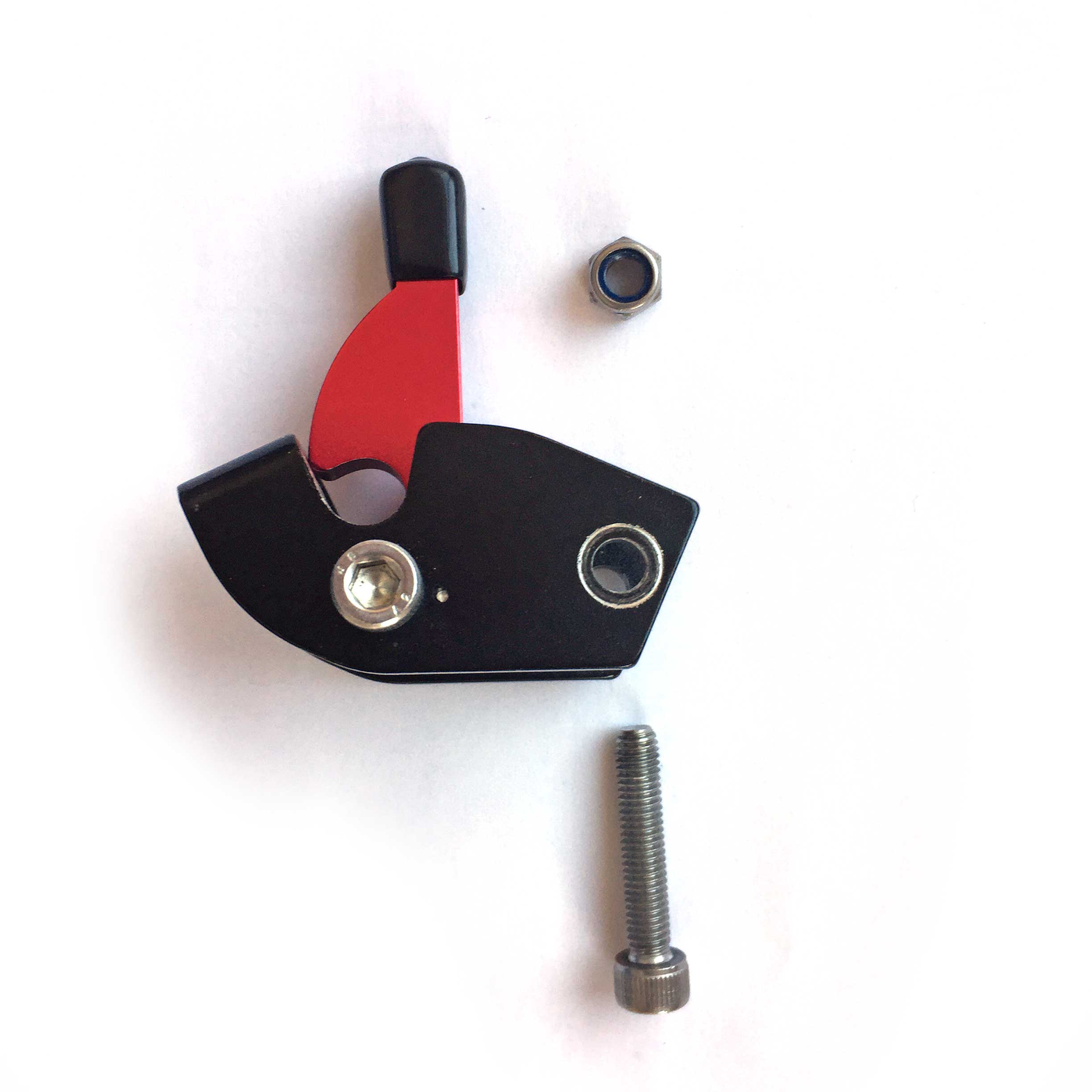 Rack arms are adjusted by loosening the bolts holding the arms to either side of the rack, sliding them to the desired position and re-tightening the bolts. The arms should meet the latch on the upper half of the lever for the best engagement.