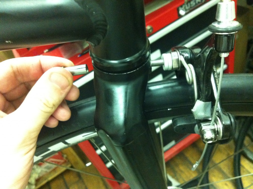 I’ll be installing a dual pivot road caliper. Caliper brakes are the design of choice for most bikes meant for on road riding. They mount to a single point above the wheel, which allows the brake arms to automatically center on the rim (theoretically). Larger tires require longer and deeper calipers, which in turn have less mechanical advantage. This is why you don’t see caliper brakes on mountain bikes or cruisers with fat tires.
