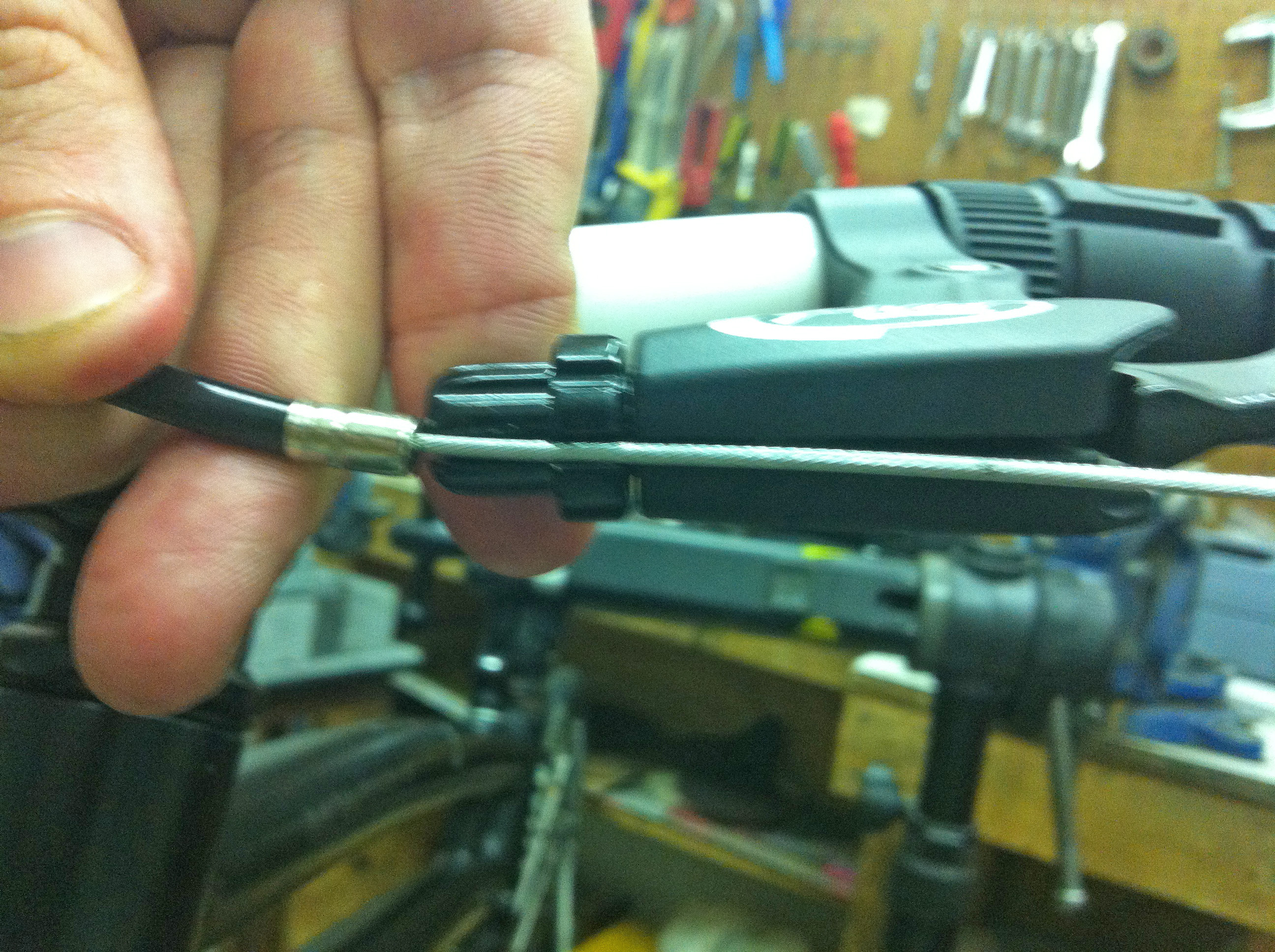 On one end of any bicycle brake cable is a metal piece that allows it to hook into the brake lever. There are road bike cables which are made for drop bar levers, and there are mountain bike cables which are made for any flat bar brake lever. The only difference is the shape of that end piece. Some cables come with mountain on one end and road on the other. With these, just cut off the end you don’t need. Push the cable through the slot in the barrel adjuster: