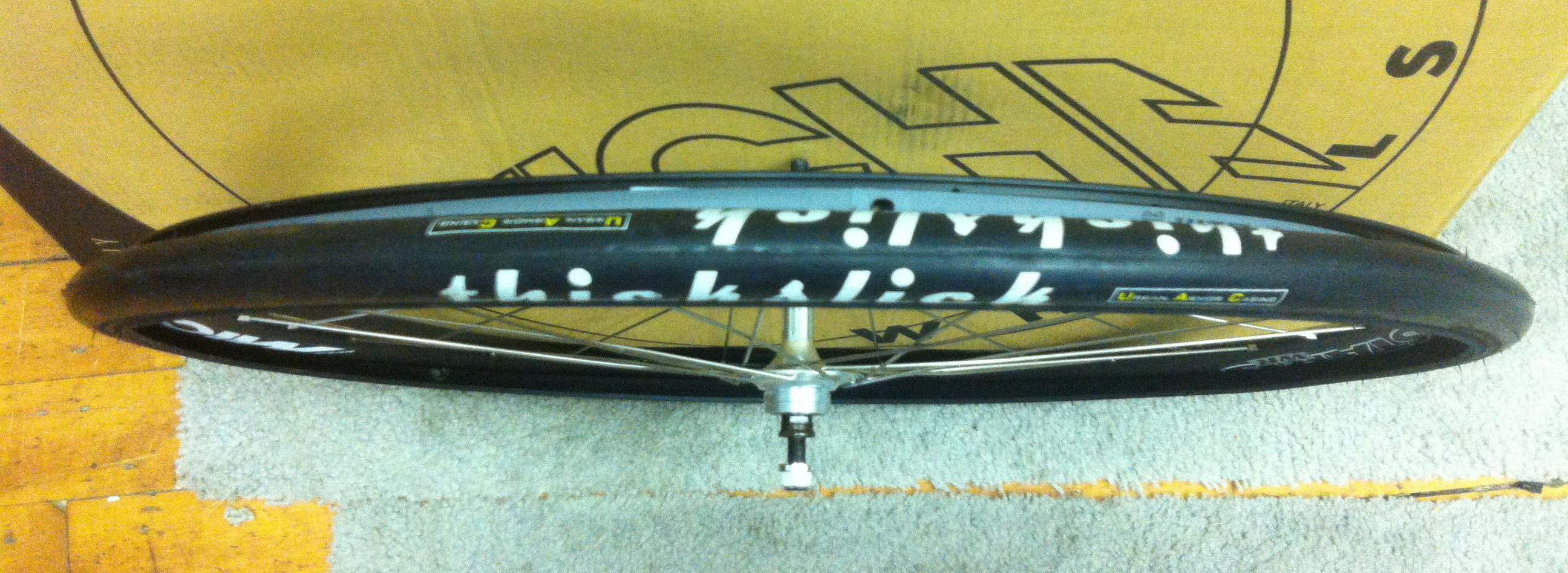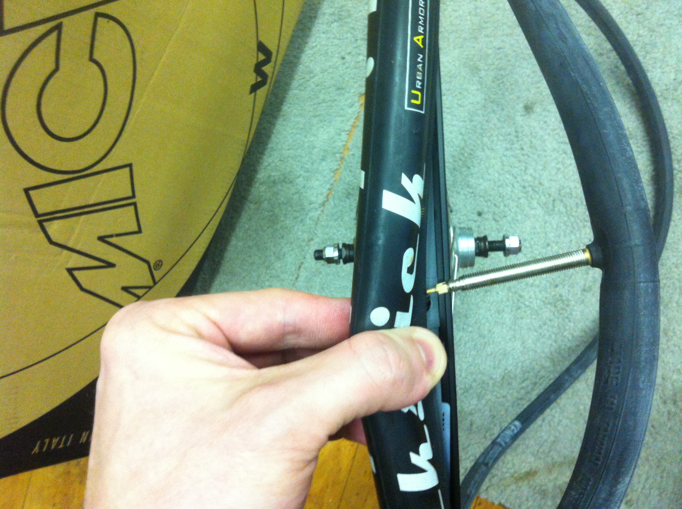 The first thing you need to do with a brand new wheelset is install rim tape. Bicycle rims are drilled for each spoke which leaves a series of holes around the exterior: