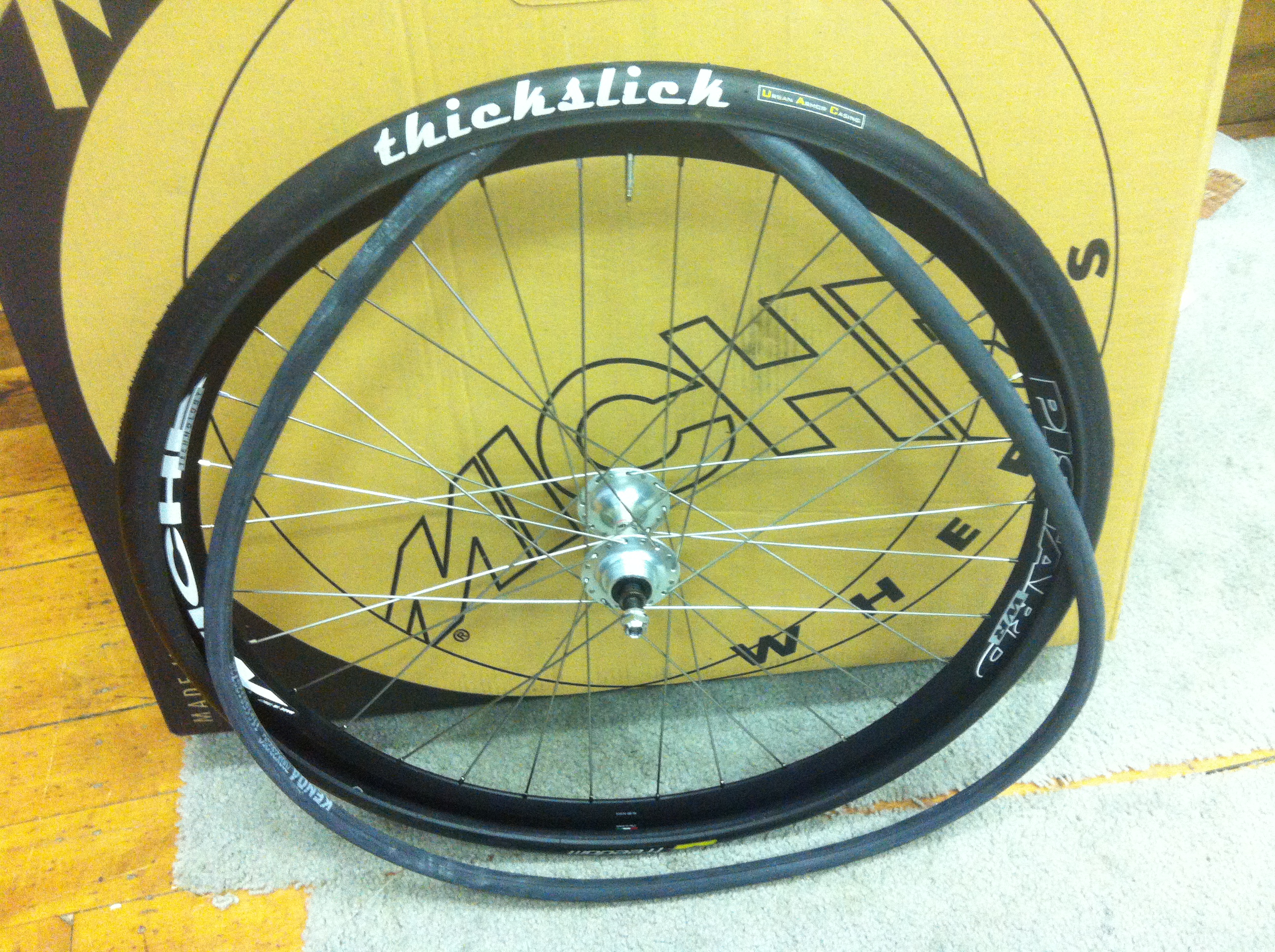 The next step for my custom Montague folding bike is a new wheelset. With horizontal, track style dropouts, and 120mm hub spacing, the Boston is made specifically for use as a single speed. The stock version comes with a flip flop hub; a freewheel on one side, a fixed cog on the other. You can switch between the two by simply turning the wheel around. I’ve had a fixed gear in the stable for years now, and I think it’s a lot of fun (of course I have a geared road bike as well…and a mountain bike… and a bmx bike. Who could have just one bike?!). So, I’ve picked up a Miche wheelset with track hubs, to make this Boston a fixed commuter.