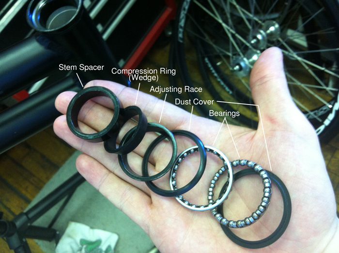 As you remove the fork, you’ll see there are several parts to the headset, both above and below the frame’s head tube. As you take them off, try to keep them in order to make re-installation easier. The headset also includes the cups that are press fit into the frame, and the crown race which is pressed onto the base of the fork’s steerer tube. We’ll leave those in place and give everything a thorough cleaning: