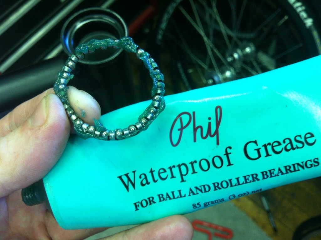 My headset bearings were pretty dirty and gummed up with debris, so it’s no wonder they weren’t turning smoothly. This headset uses caged ball bearings. They’re easy to clean, and difficult to lose. As you can see above, they came out looking pretty good. Some headsets have sealed cartridge bearings, some have loose ball bearings, but with any of these designs, grease is your friend: