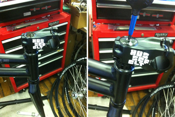 Slide your (in this case new) stem on to the steerer tube, and push it down so it’s snug against the headset. The top of the stem should actually stick up above the top of the steerer tube by about 3-4mm. If it’s too short, add another spacer under the stem. Put the top cap back on, and thread the cap bolt back into the star nut. Make it snug, to compress the headset bearings, but don’t overtighten. If you do, it will be hard to turn the fork, and you’ll be putting extra wear on the bearings and cups.