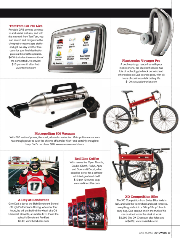 The XO Competition from Swiss Bike folds in half, and with the front wheel and seat removed, everything stuffs into a 36-by-28-by-12-inch carry bag. Dad can put one in the trunk of his car or slide it under his desk at work. $2,299 (the DX Crossover also folds and is $499): www.swissbike.com
