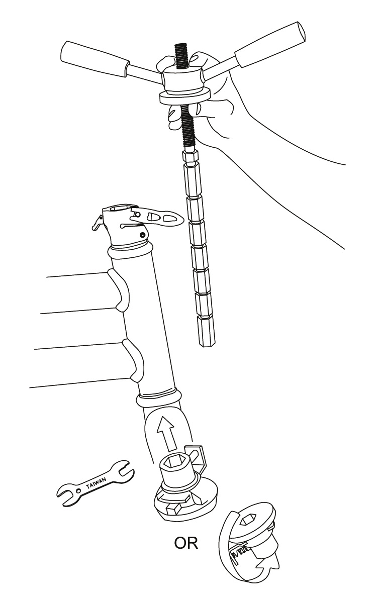 1. Remove the pedal-axles from the crankarms; turn the right pedal-axle counterclockwise, but turn the left pedal-axle clockwise.
