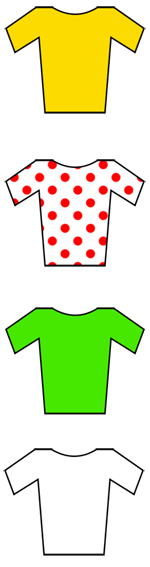 At the end of each stage, in addition to acknowledging the stage winner, four special jerseys are awarded. They are handed off from rider to rider depending who is leading the following competitions: