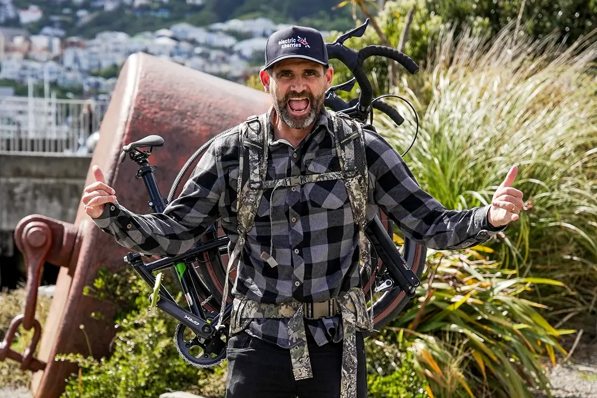 This amazing custom Montague folding bike comes to you all the way from Bicycle Junction in Wellington, New Zealand. The concept for this build, and the very unique use-case, comes from the mind of Mike Casey, who Bicycle Junction says “is one of those people who just does things differerently”. Mike owns and operates Forest Lodge Orchard, the first cherry orchard in the world that is 100% electric and zero fossil fuel in its operation. Mike is also the CEO of Rewiring Aotearoa, a non-profit dedicated to helping New Zealanders transition to sustainable energy.
