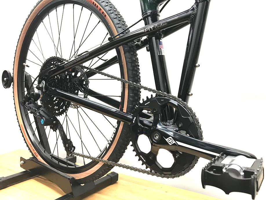 Additional unique touches include a 28-inch riser handlebar, a Box Three Prime 9 x-wide (11-50t) drivetrain, and a Brooks B17 saddle for comfort and a refined look. Even though this frame has the “classic” folding frame design, it still folds in seconds to easily stow away wherever this bike travels.